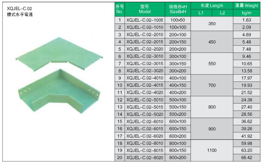 XQJEL_C.02槽式水平彎通產(chǎn)品型號、規(guī)格、重量等參數(shù)及XQJEL_C槽式電纜橋架在不同跨距下允許均布載荷變形量。