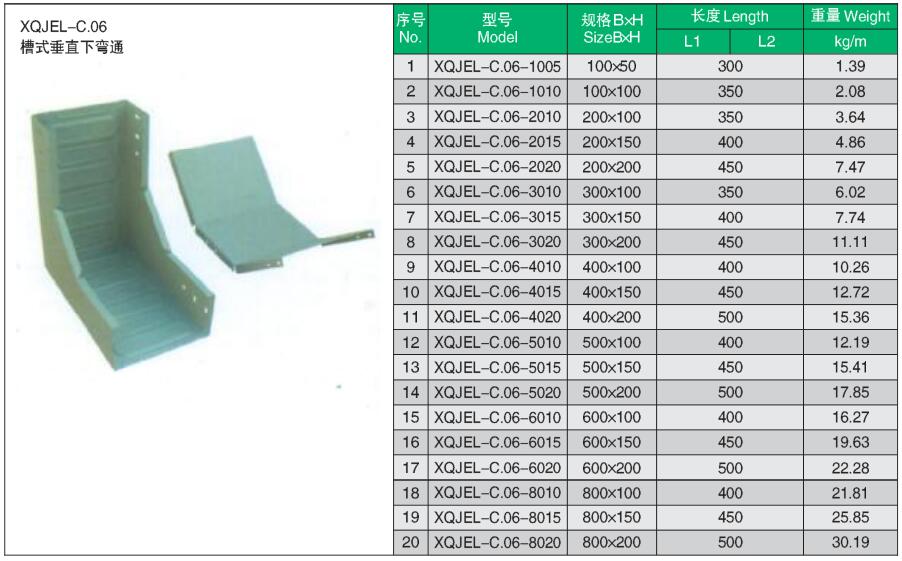 XQJEL_C.06槽式垂直下彎通產品型號、規格、重量等參數及XQJEL_C槽式電纜橋架在不同跨距下允許均布載荷變形量。