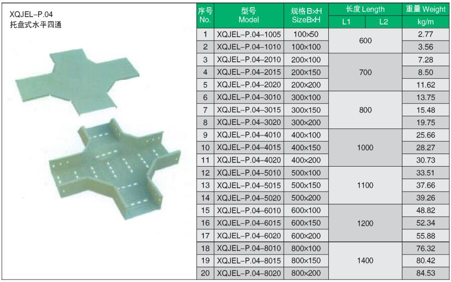 XQJEL_P.04托盤式四通產品型號、規格、重量等參數及XQJEL_P托盤式電纜橋架在不同跨距下允許均布載荷變形量。
