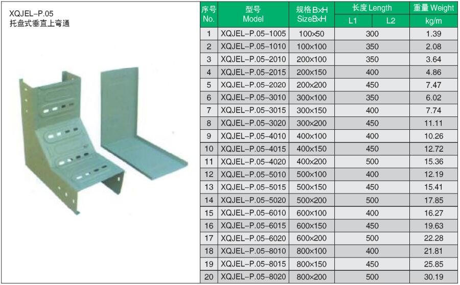 XQJEL_P.05托盤式上彎通產品型號、規格、重量等參數及XQJEL_P托盤式電纜橋架在不同跨距下允許均布載荷變形量。