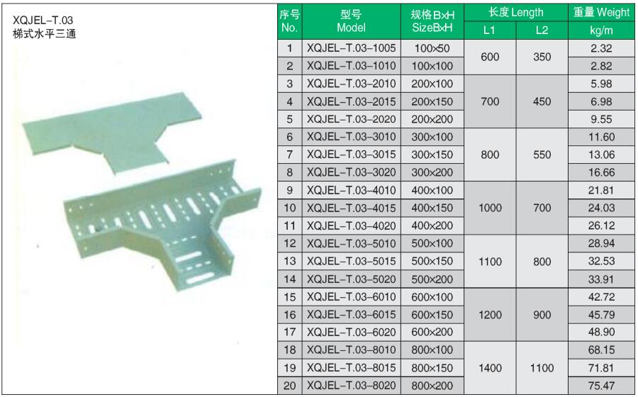 XQJEL_T.03梯式三通產品型號、規格、重量等參數及XQJEL_T梯式電纜橋架在不同跨距下允許均布載荷變形量。