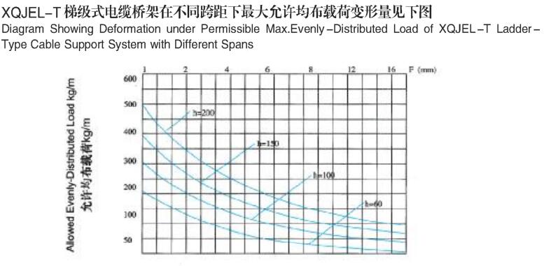 XQJEL_T.05梯式垂直上彎通產品型號、規格、重量等參數及XQJEL_T梯式電纜橋架在不同跨距下允許均布載荷變形量。