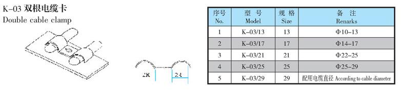 本文將會在K-03雙根電纜卡的型號、用途、規格、重量等方面做詳細的說明與介紹,江蘇海馳電氣制造有限公司作為是專業的K-03雙根電纜卡生產廠家,為您選購適合自己的產品做一定的指導是必要的。